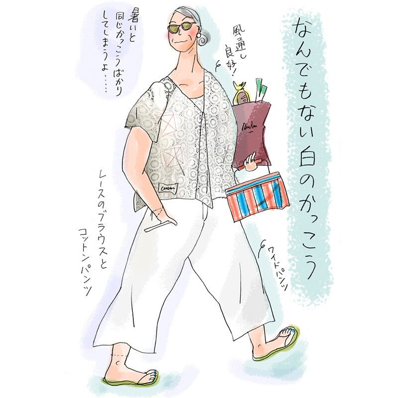空気の通りがいいレースのブラウスと薄手のコットンパンツ、着ていてラクなものしか身につけたくない。
